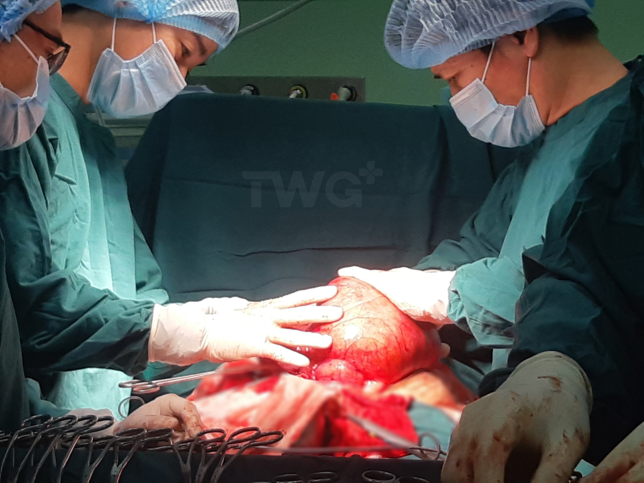 Ekip bác sĩ phẫu thuật cắt khối u nặng hơn 3 kg bằng phương pháp mổ hở.